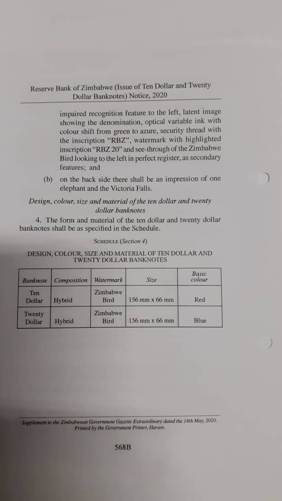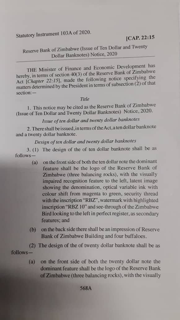 The reserved bank of Zimbabwe have released statutory instrument on the new $10 and $20 banknotes in Zimbabwe.