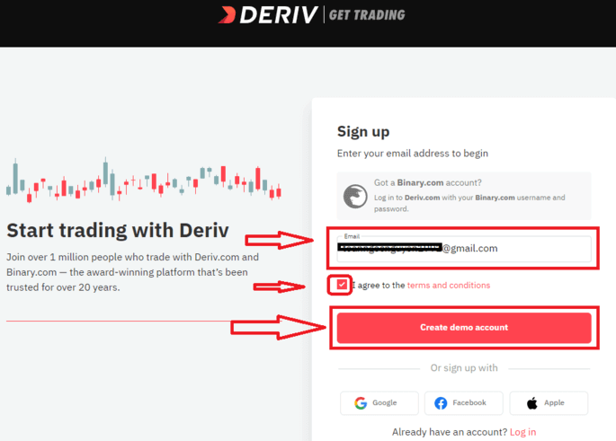 It is very easy and fast to create an account with Deriv. All you need is a working email that is active and can register right away. If you have a Binary.com account, you can use your Binary.com account credentials as well in order to log in with Deriv. Traders will be redirected to a page where they will be asked to provide an email address so to open a live account. Next, they must agree to the terms and conditions of Deriv.